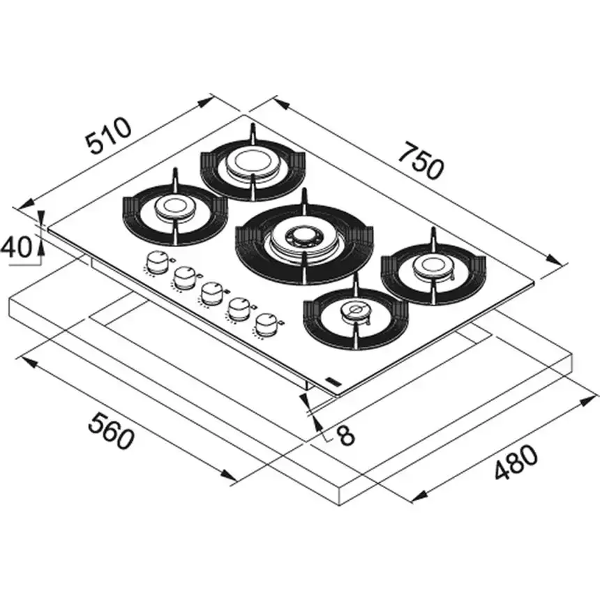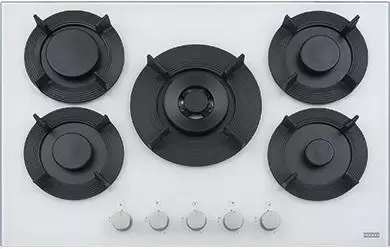 Выбор газовой варочной панели чаще всего обусловлен тем, что в частный дом или квартиру проведен именно газ в качестве обогрева. Работать с этой моделью довольно просто, так как мощность нагрева видна невооруженным взглядом — по силе огня в горелке. Количество конфорок в этой модели: 5. Горелки с двойной короной позволяют увеличивать мощность нагрева в зависимости от диаметра посуды.