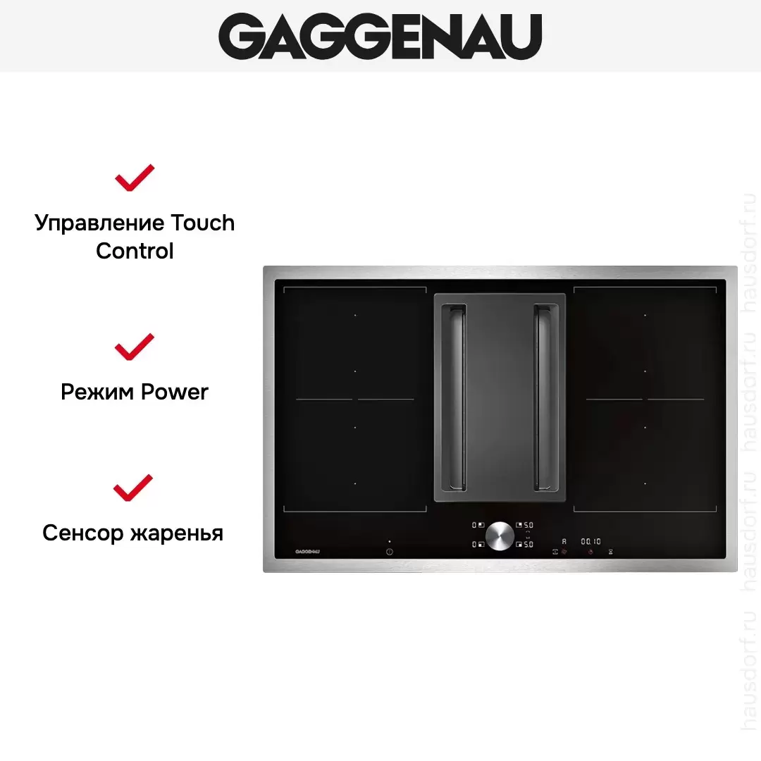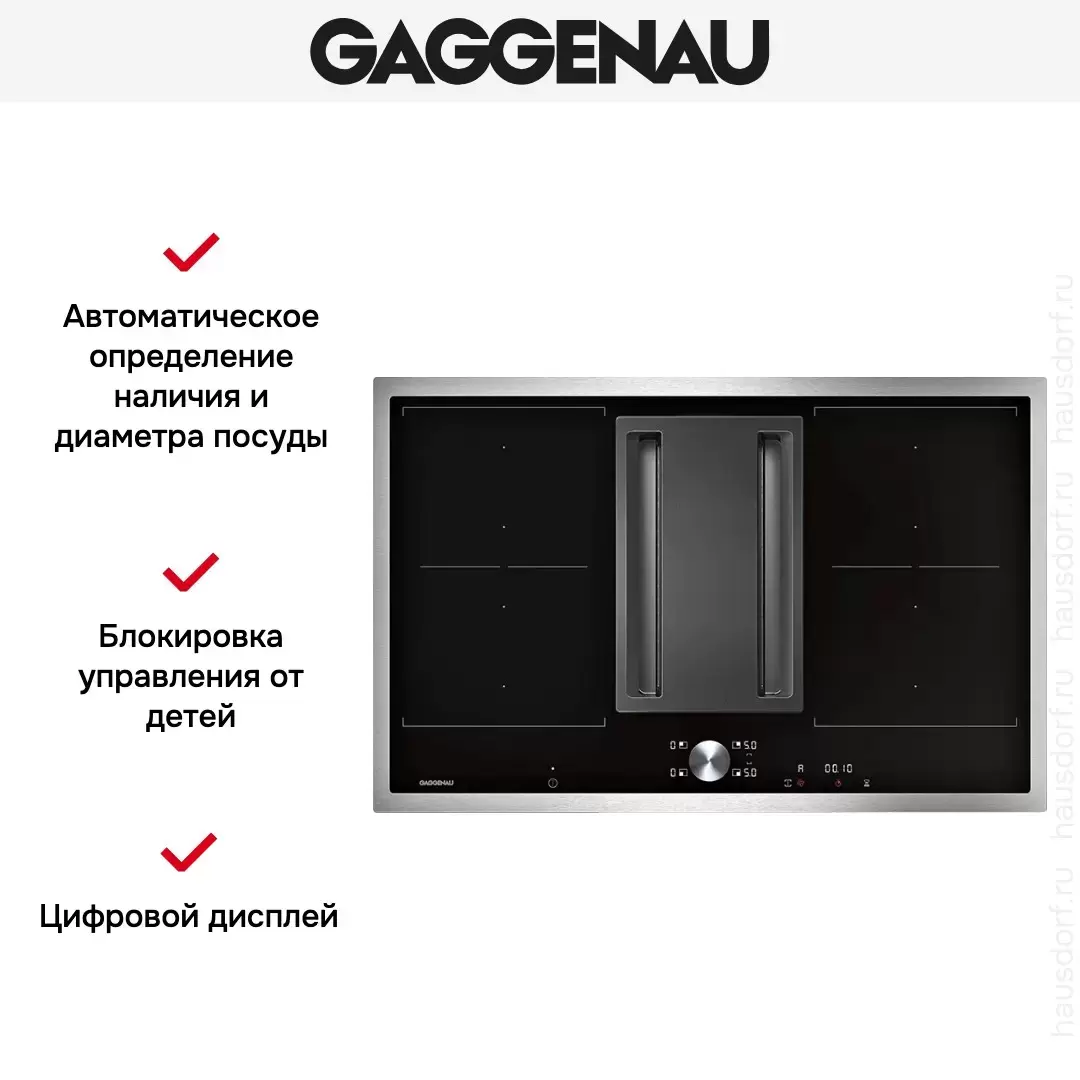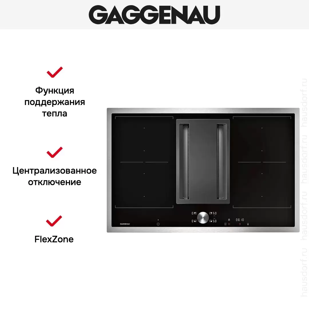 Варочная панель Gaggenau CV 282-110 оборудована встроенной вытяжкой, которая включается автоматически при работе любой их конфорок. Панель управления Twist-Pad со съемным магнитным переключателем удобна в использовании и гарантирует безопасность эксплуатации.