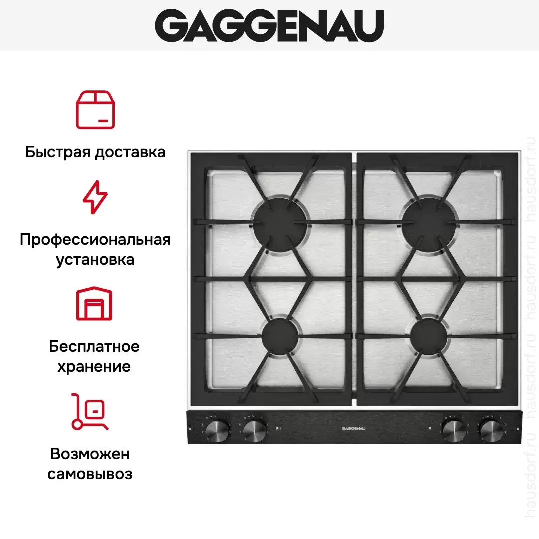 Варочная панель Gaggenau VG 264-220 оснащена чугунными держателями для посуды. Этот материал отличается высокой прочностью и способен выдерживать высокие температуры. Благодаря термоэлектрической защите от утечки газа обеспечивается безопасность эксплуатации.