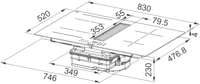 Модель выполнена в строгом чёрном цвете с безрамочным оформлением, что создаёт эффект бесшовного соединения с рабочей поверхностью и подчёркивает минималистичный, технологичный стиль. Ширина устройства — 83 см — позволяет использовать его на просторных кухнях, а компактная высота всего 23 см обеспечивает удобное встраивание в стандартную нишу размером 74,6 × 47,68 см.