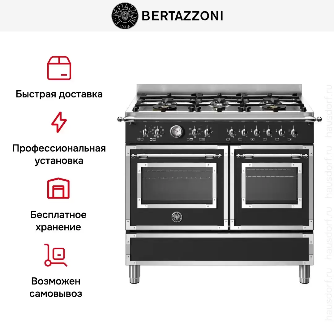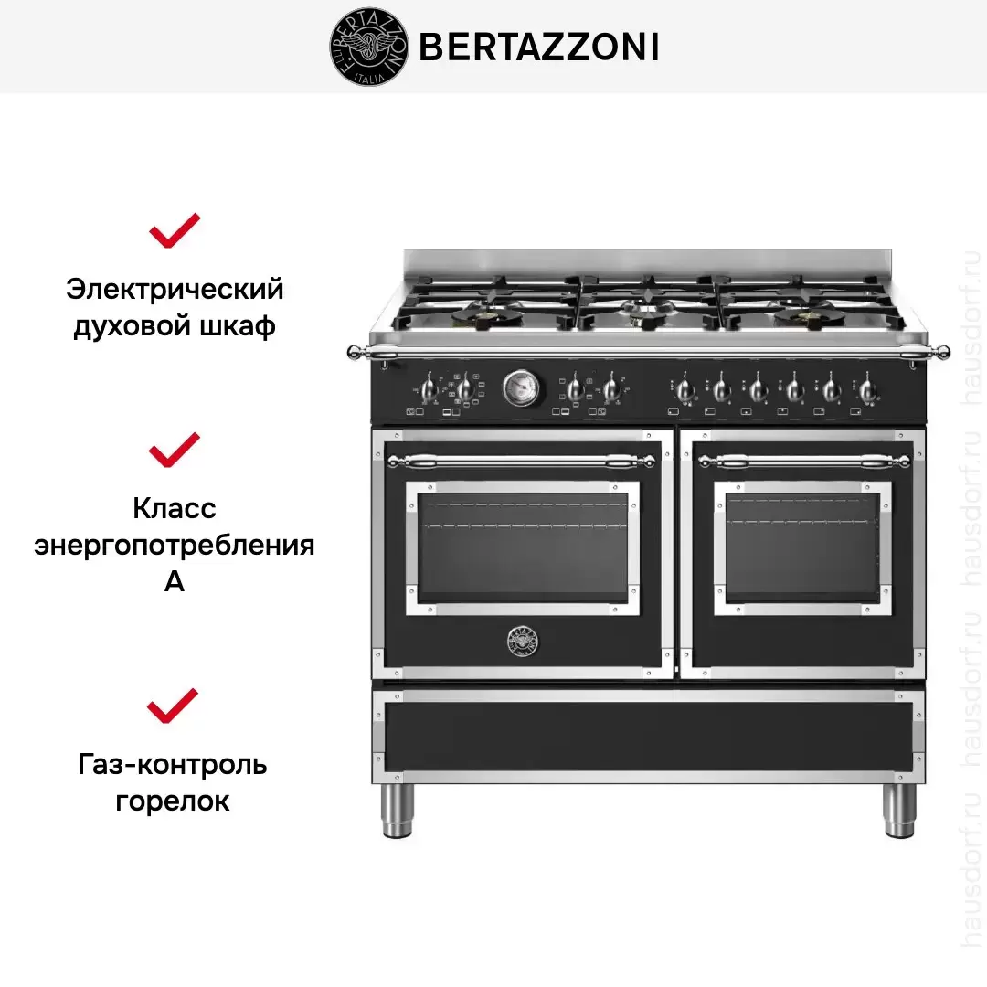 Комбинированный варочный центр Bertazzoni HER106L2ENET оснащен газовой варочной поверхностью и двойным электрическим духовым шкафом. Газовая панель из нержавеющей стали оборудована 6 конфорками, две из которых имеют два контура. WOK конфорка предназначена для ускоренного разогрева, использования посуды с круглым дном и приготовления блюд в азиатском стиле. Для удобства предусмотрен электроподжиг.