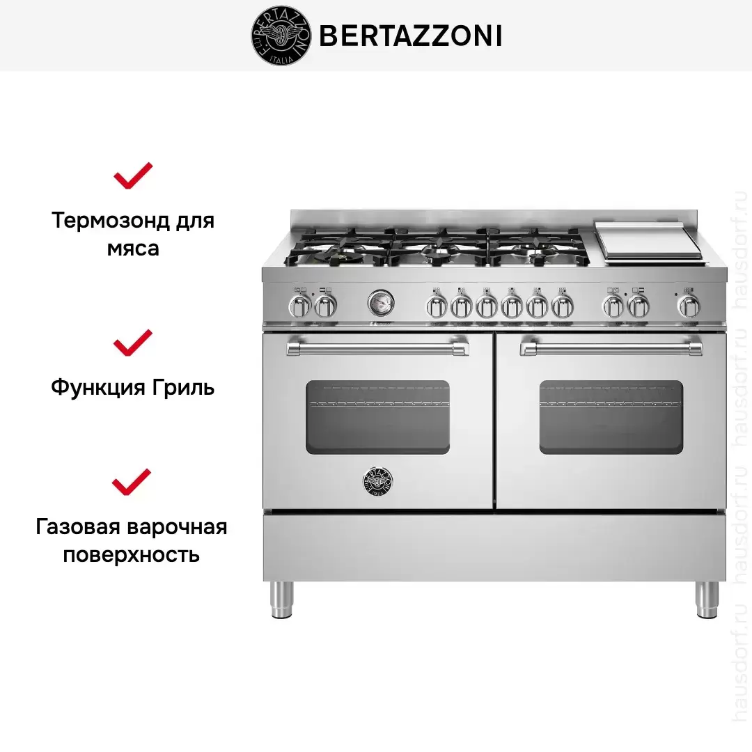 Комбинированный варочный центр Bertazzoni MAS126G2EXT в цвете нержавеющая сталь оснащен газовой варочной поверхностью и двойным электрическим духовым шкафом. Газовая панель из нержавеющей стали оборудована 6 конфорками, одна из которых имеет два контура. WOK конфорка предназначена для ускоренного разогрева, использования посуды с круглым дном и приготовления блюд в азиатском стиле. Теппан зона нагрева позволит готовить без использования посуды.