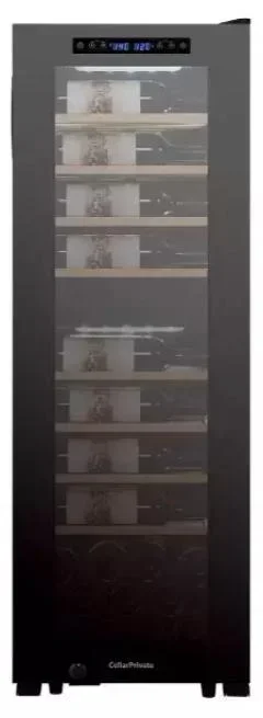 Стеклянная дверь — дополнительный изящный штрих к общему дизайну модели. Специальное покрытие защищает вино от влияния ультрафиолетовых лучей, которые проникают, если шкаф находится в солнечной комнате. Цвет корпуса — черный.