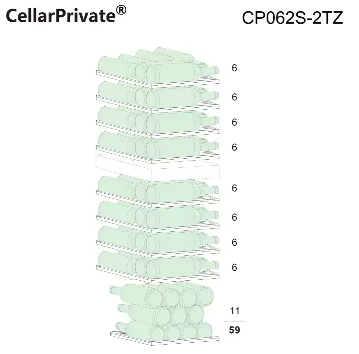 Винный холодильник CellarPrivate CP062S-2TZ имеет две температурные зоны, в которых одновременно можно хранить разные сорта алкоголя и выставлять разные сочетания настроек. Он устанавливается отдельно, что удобно, если у вас есть специальное помещение — кладовая, погреб и т.д. Количество бутылок, которое можно разместить с учетом полной комплектации и из расчета объема бутылки 0,75 л, — 59 шт.