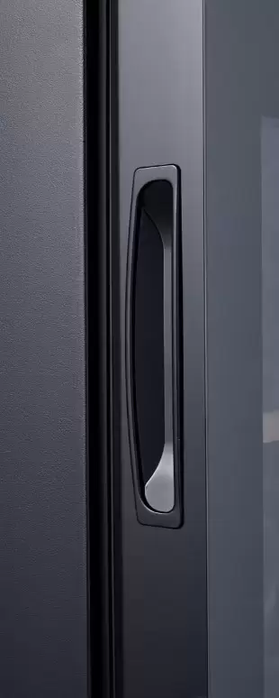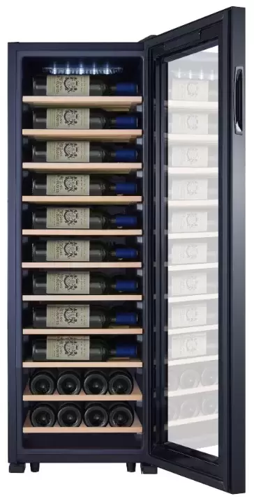 Стеклянная дверь — дополнительный изящный штрих к общему дизайну модели. Специальное покрытие защищает вино от влияния ультрафиолетовых лучей, которые проникают, если шкаф находится в солнечной комнате. Цвет корпуса — черный.