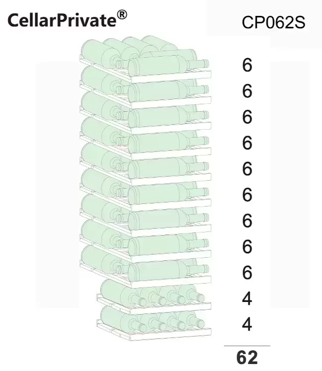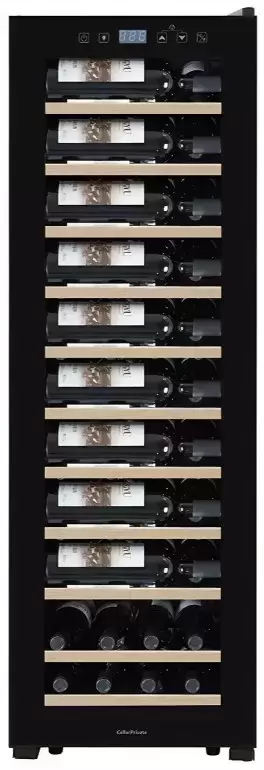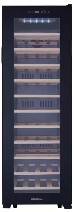 Винный холодильник CellarPrivate CP062S имеет одну температурную зону, в которой можно разместить бутылки и единовременно выставить только одну комбинацию настроек. Он устанавливается отдельно, что удобно, если у вас есть специальное помещение — кладовая, погреб и т.д. Количество бутылок, которое можно разместить с учетом полной комплектации и из расчета объема бутылки 0,75 л, — 62 шт.