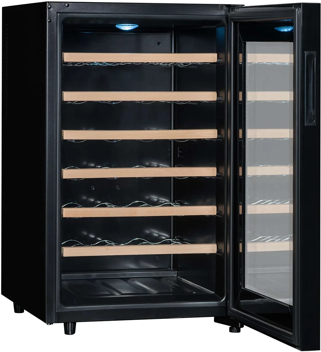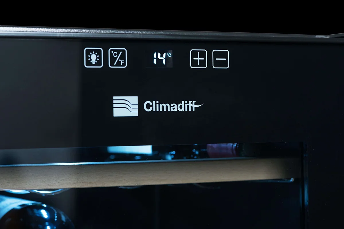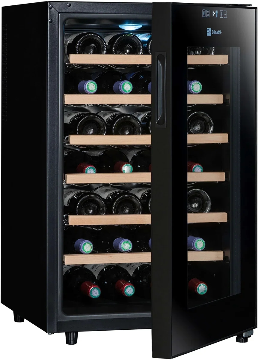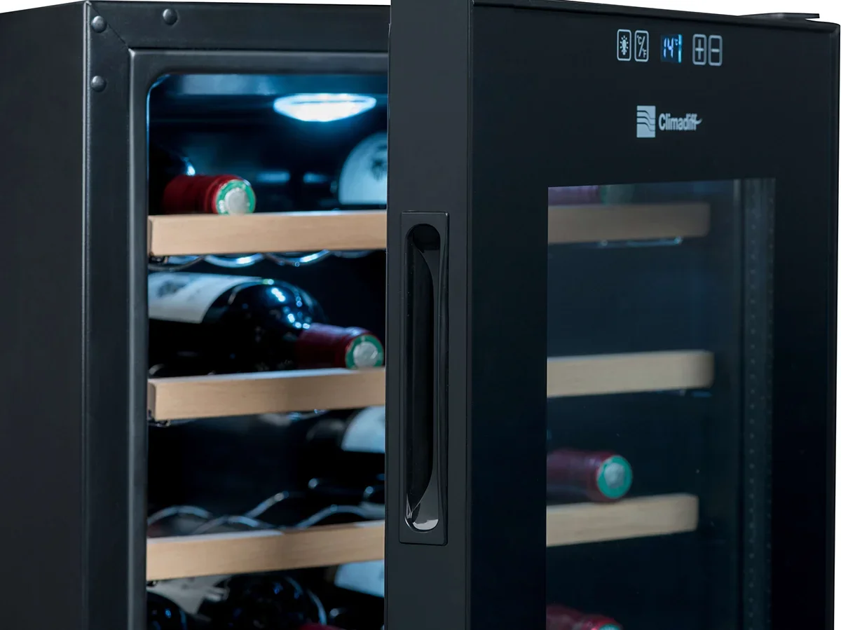 Винный шкаф Climadiff CC28 — монотемпературный отдельно стоящий прибор в строгом чёрном корпусе. Его компактные габариты 73.5×45×52.8 см экономят место на кухне или в мини-баре. Вместительность 28 бутылок по 0,75 л и полезный объём 70 литров делают модель удобной для домашней коллекции и приёма гостей. Дверь со стеклопакетом и тонировкой защищает напитки от УФ‑лучей, а правый дверной упор учитывайте при выборе места установки.