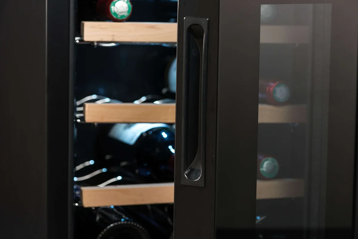 Внутреннее пространство организовано шести металлическими полками, каждая рассчитана на стабильную поддержку бутылок. Металл прочен и выдерживает частые перестановки, при этом полки легко очищаются от капель и пыли. Встроенная светодиодная подсветка равномерно освещает содержимое и не нагревает его, поэтому освещение не влияет на микроклимат. Сенсорное управление с дисплеем обеспечивает точную установку в диапазоне 11-18 °C и простоту в эксплуатации.