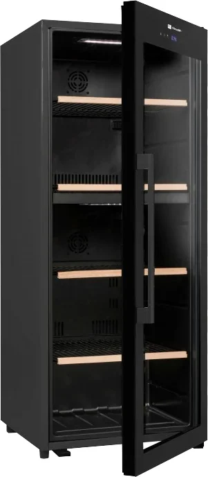Полки комбинированные: металл несёт прочность, а деревянные элементы уменьшают вибрации и эстетично смотрятся при демонстрации вин. Четыре выдвижных полки упрощают доступ к бутылкам и позволяют удобно разложить коллекцию по сортам или годам. Встроенные амортизаторы минимизируют вибрационные колебания, что важно для выдержанных вин с осадком. Регулируемые ножки упрощают установку на неровной поверхности и улучшают герметичность дверцы.