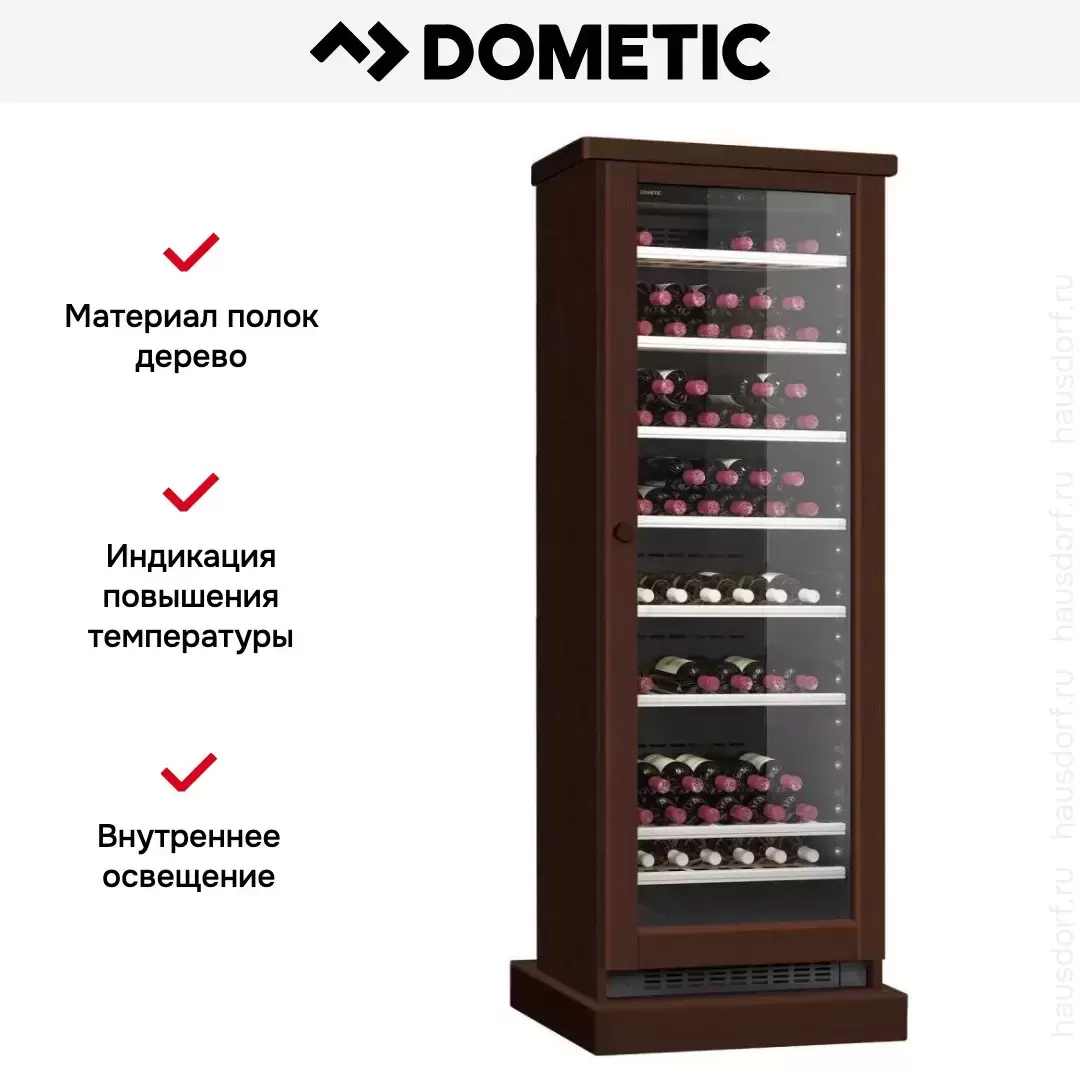 Винный холодильник Dometic C125G Wooden Walnut имеет одну температурную зону, в которой можно разместить бутылки и единовременно выставить только одну комбинацию настроек. Он устанавливается отдельно, что удобно, если у вас есть специальное помещение — кладовая, погреб и т.д. Количество бутылок, которое можно разместить с учетом полной комплектации и из расчета объема бутылки 0,75 л, — 125 шт.