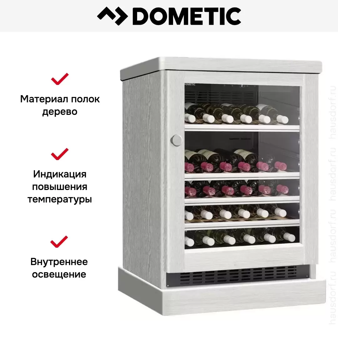 Винный холодильник Dometic C50G Wooden Loft White имеет одну температурную зону, в которой можно разместить бутылки и единовременно выставить только одну комбинацию настроек. Он устанавливается отдельно, что удобно, если у вас есть специальное помещение — кладовая, погреб и т.д. Количество бутылок, которое можно разместить с учетом полной комплектации и из расчета объема бутылки 0,75 л, — 50 шт.