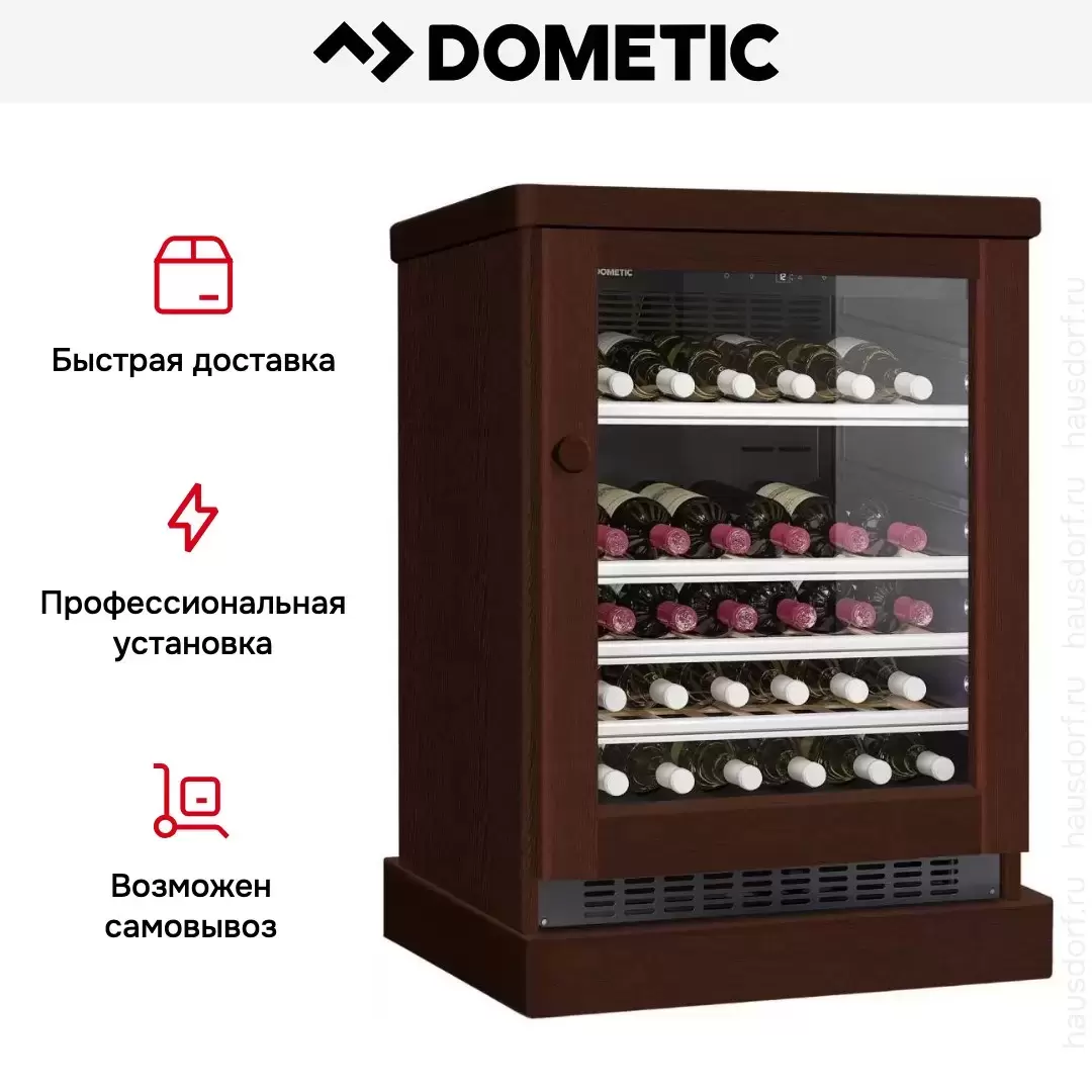 Винный холодильник Dometic C50G Wooden Walnut имеет одну температурную зону, в которой можно разместить бутылки и единовременно выставить только одну комбинацию настроек. Он устанавливается отдельно, что удобно, если у вас есть специальное помещение — кладовая, погреб и т.д. Количество бутылок, которое можно разместить с учетом полной комплектации и из расчета объема бутылки 0,75 л, — 50 шт.
