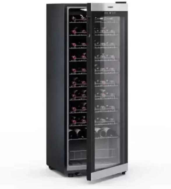 Стеклянная дверь — дополнительный изящный штрих к общему дизайну модели. Специальное покрытие защищает вино от влияния ультрафиолетовых лучей, которые проникают, если шкаф находится в солнечной комнате. Хранение становится еще безопаснее и герметичнее благодаря нескольким слоям стекол. Цвет корпуса — серебристый.
