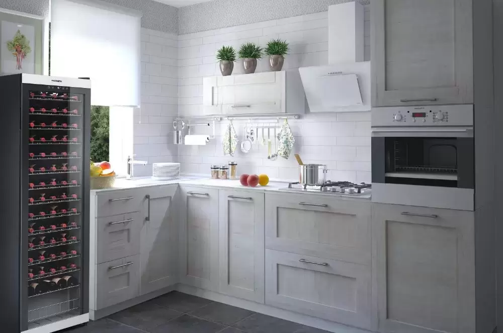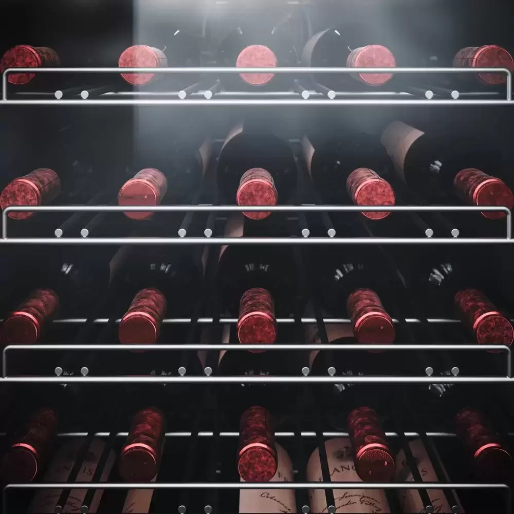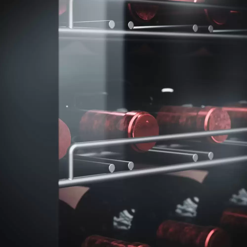 Стеклянная дверь — дополнительный изящный штрих к общему дизайну модели. Специальное покрытие защищает вино от влияния ультрафиолетовых лучей, которые проникают, если шкаф находится в солнечной комнате. Хранение становится еще безопаснее и герметичнее благодаря нескольким слоям стекол. Цвет корпуса — серебристый.