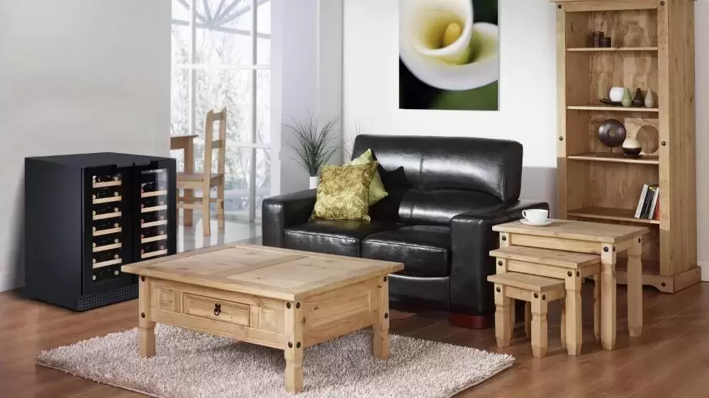 Стеклянная дверь — дополнительный изящный штрих к общему дизайну модели. Специальное покрытие защищает вино от влияния ультрафиолетовых лучей, которые проникают, если шкаф находится в солнечной комнате. Хранение становится еще безопаснее и герметичнее благодаря нескольким слоям стекол. Цвет корпуса — черный.