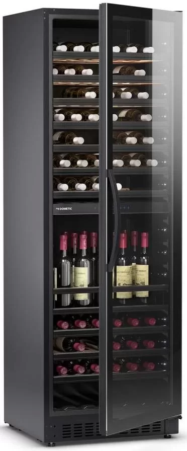 Винный холодильник Dometic E115FG Elegance имеет две температурные зоны, в которых одновременно можно хранить разные сорта алкоголя и выставлять разные сочетания настроек. Он устанавливается отдельно, что удобно, если у вас есть специальное помещение — кладовая, погреб и т.д. Количество бутылок, которое можно разместить с учетом полной комплектации и из расчета объема бутылки 0,75 л, — 115 шт.