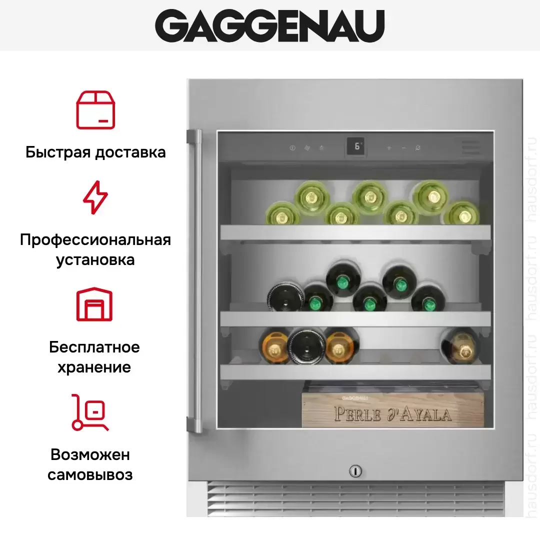 Gaggenau RW 402-261 — компактный винный шкаф с сенсорным управлением. Модель характеризуется встраиваемым типом установки и снабжена перенавешиваемой дверцей в рамке из нержавеющей стали. Температура внутри прибора регулируется в диапазоне от +5 до +20 ˚С.