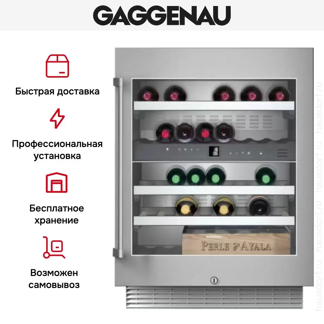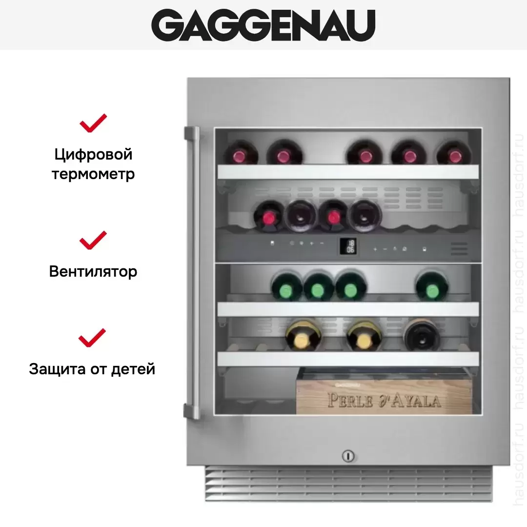 Винный холодильник Gaggenau RW 404-261 имеет две температурные зоны, в которых одновременно можно хранить разные сорта алкоголя и выставлять разные сочетания настроек. Он встраивается в нишу, что удобно, если у вас ограничен метраж помещения. Благодаря компактным размерам данная модель — отличный выбор для офиса, гостиничного номера. Количество бутылок, которое можно разместить с учетом полной комплектации и из расчета объема бутылки 0,75 л, — 34 шт.