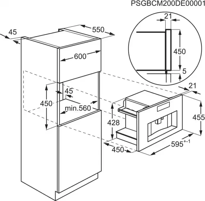 Габариты прибора — 45,5 см в высоту, 59,5 см в ширину и 45 см в глубину — соответствуют стандартным размерам кухонных ниш. Для корректной установки требуется ниша размером 45×56×55 см (Ш×В×Г), что делает интеграцию простой и безопасной. Встроенная модель не только экономит место, но и защищена от пыли и брызг, что продлевает срок её службы и упрощает уход.