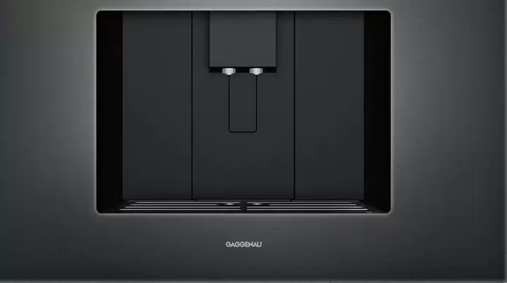 Встраиваемая кофемашина Gaggenau CMP 250-102 — полностью автоматическая, в корпусе из стали оттенка антрацит, с эффектной подсветкой зоны раздачи. В ней используется два типа кофе — цельные зерна с помолом непосредственно перед варкой и молотый двух разных сортов. Для измельчения служит мощная кофемолка с керамическими самозатачивающимися жерновами.