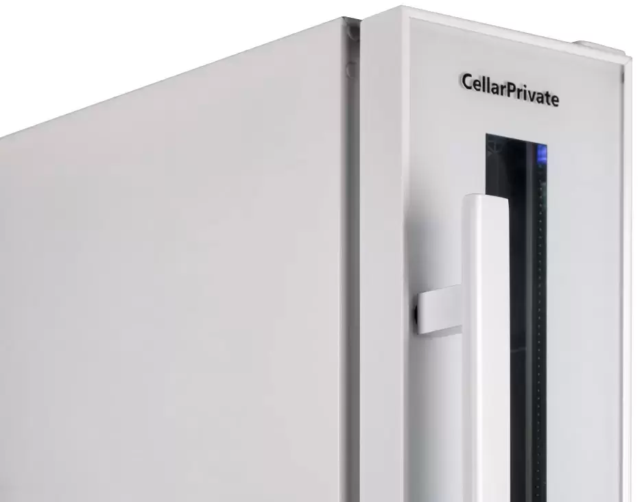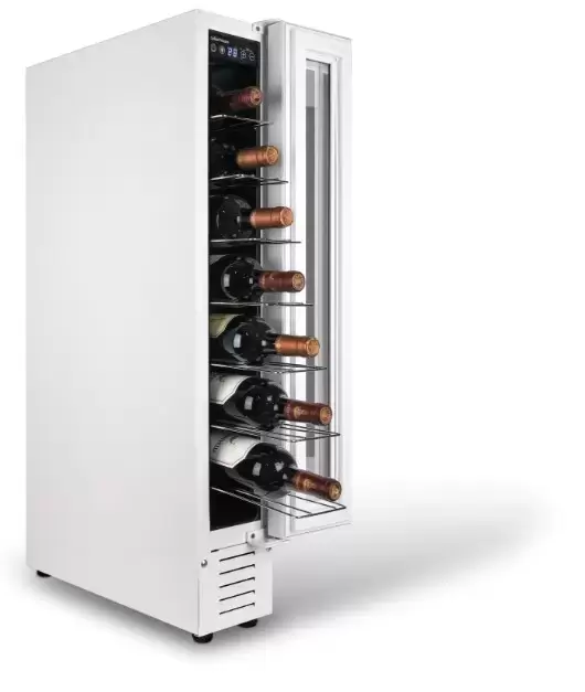 Корпус в белом цвете и узкая фронтальная панель шириной 15 см делают аппарат незаметным в интерьере и удобным для размещения в небольшой нише. Стеклянная дверь с тонировкой и защитой от УФ-излучения бережёт напитки от вредного света, а накладная ручка и правый дверной упор упрощают доступ и монтаж в стандартных конфигурациях кухонного гарнитура.