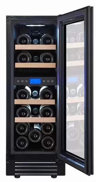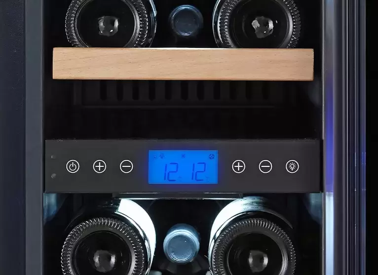 Двухтемпературная конструкция дает две независимые зоны с диапазоном от 5 до 20 °C. Верхняя область подходит для белых и игристых вин при 5-12 °C, нижняя — для красных при 12-20 °C. Компрессорное охлаждение обеспечивает стабильность поддерживаемых значений даже при высокой летней температуре. Сенсорное управление и ясный дисплей позволяют точно выставлять параметры, а автоматическое оттаивание снижает необходимость регулярного обслуживания.