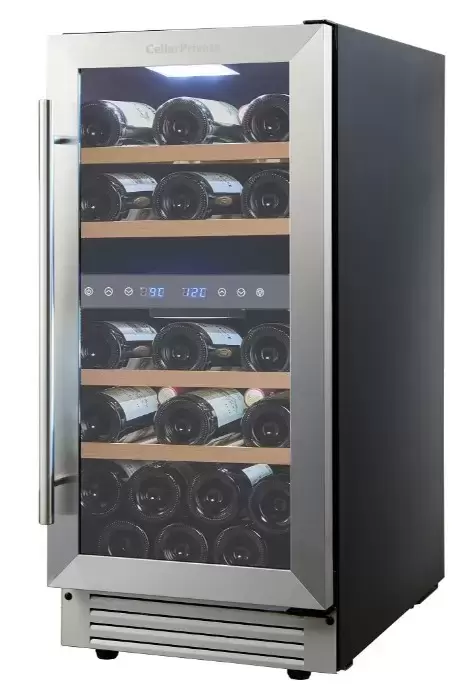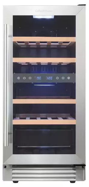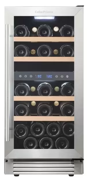 Винный шкаф CellarPrivate CP027-2T впечатляет лаконичным металлическим обликом и продуманной встраиваемой конструкцией. Его компактные габариты 82×38×58 см помогут органично вписать аппарат в кухонную колонну или под столешницу. Для монтажа предусмотрена ниша размером 82.5×39×61 см, а аккуратная накладная ручка делает переднюю панель визуально легкой. Дверь со стеклопакетом тонирована и защищена от УФ-излучения, что сохраняет цвет и аромат напитков. По умолчанию дверной упор справа, но возможность перенавешивания дает свободу выбора стороны открывания.