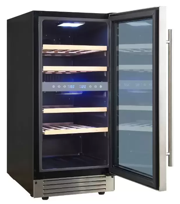 Полезный объем 76 литров и вместимость до 27 бутылок по 0,75 л позволяют сформировать небольшую коллекцию или поддерживать ассортимент в домашнем баре. Четыре деревянные полки аккуратно фиксируют бутылки и гасят вибрации, что важно для бережного хранения. Внутреннее светодиодное освещение удобно для просмотра этикеток и не нагревает содержимое. Вес 31,4 кг и продуманная конструкция облегчают встраивание и обслуживание.
