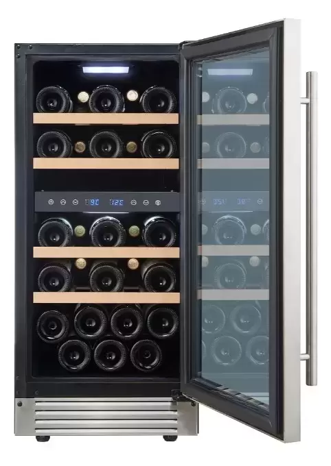 Это двухтемпературный прибор с одной камерой и двумя независимыми зонами, каждая из которых управляется отдельно. Верхняя область регулируется в пределах 5-12 °C, что идеально для белых и игристых сортов. Нижняя зона рассчитана на 12-20 °C, здесь удобно хранить и слегка охлаждать красные вина. Диапазон установки 5-20 °C позволяет точно задавать параметры для разных стилей напитков. Сенсорное управление и встроенный дисплей упрощают настройку и дают быстрый доступ к значениям.