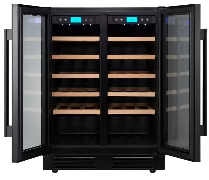 Шкаф рассчитан на 42 бутылки по 0,75 л и имеет полезный объем 126 литров. Десять деревянных полок мягко фиксируют емкости и уменьшают вибрации, что важно для бережного хранения. Дерево не впитывает холод так быстро, как металл, и создает благоприятные условия для выдержки. Двойные двери модели с дверным упором Side-by-Side упрощают доступ к каждой зоне хранения, а вес в 45 кг обеспечивает устойчивость после встраивания.