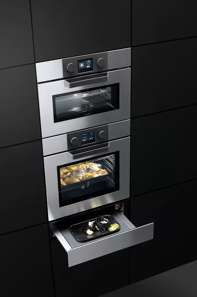 Данная модель входит в линейку ICON STEEL, ее фронт выполнен из сатиновой нержавеющей стали. Специальный световой индикатор показывает, что прибор в работе, а чтобы изменить его настройки, необходимо нажать на панель — тогда откроется камера, внутри которой расположена поворотная ручка. Внутренние стенки выполнены из стекла, которое легко чистить даже после размораживания продуктов.