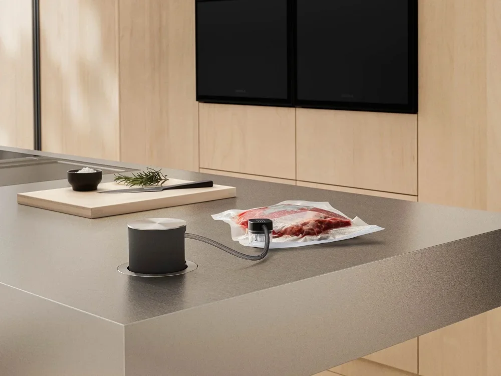 Поставляемые пакеты разных объемов и наклейки для заморозки позволяют сразу начать хранение и систематизировать продукты. Длина выдвижного вакуумного шланга 40 см обеспечивает удобство подключения к контейнерам на столе. Корпус устройства рассчитан с учетом сервисного доступа, что продлевает срок службы и упрощает обслуживание. Такой прибор станет полезным помощником для тех, кто ценит порядок в кухне, экономию продуктов и аккуратный встроенный дизайн.