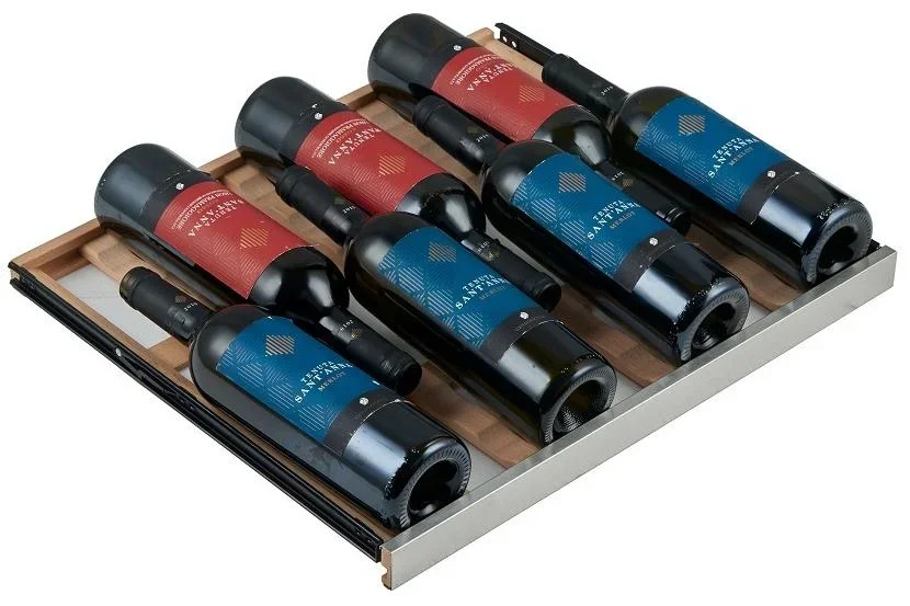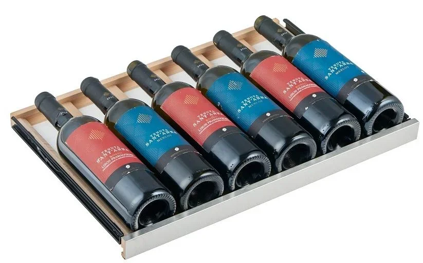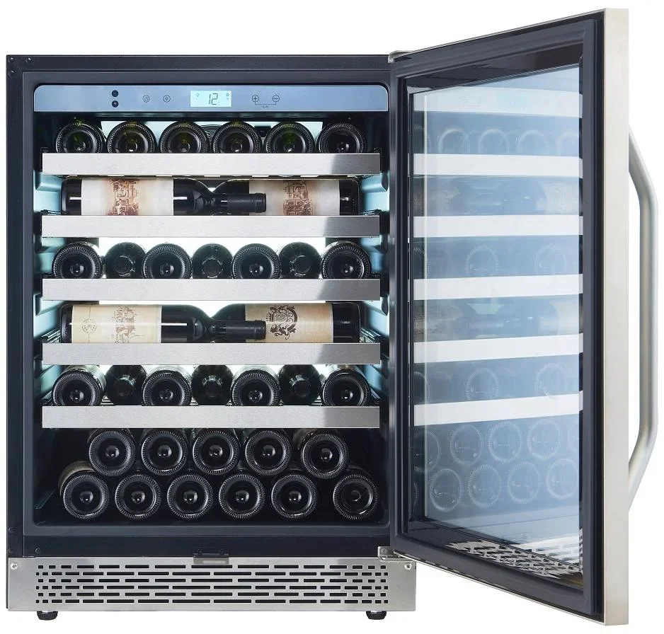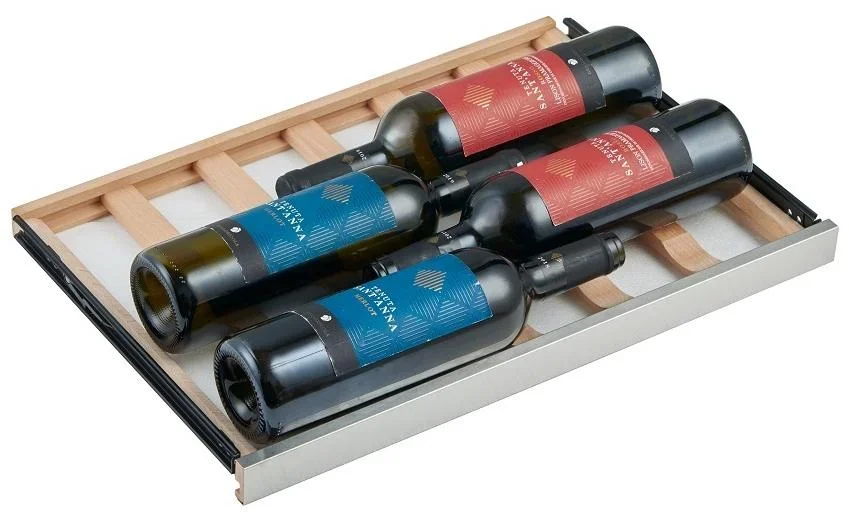 Интерьер продуман для бережного хранения: пять выдвижных деревянных полок с металлической окантовкой мягко держат бутылки и предотвращают скольжение, а съемный конструктив облегчает перестановку и чистку. Внутреннее светодиодное освещение аккуратно подсвечивает содержимое без нагрева, а вентиляция поддерживает стабильный микроклимат при встраивании. Защита от вибраций снижает риск повреждения осадка в бутылках, особенно при длительном хранении и выдержке.