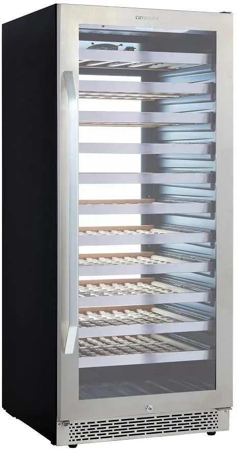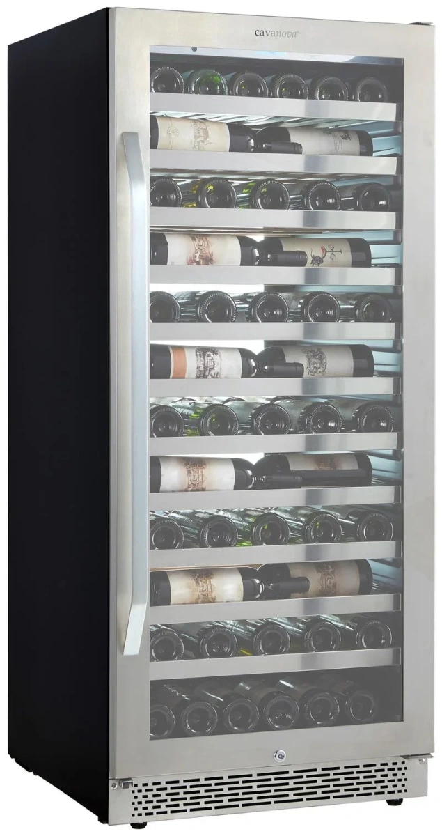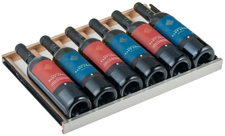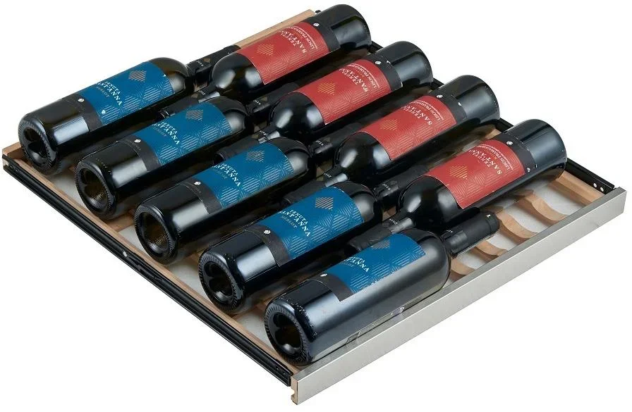 Внутреннее пространство объёмом 326 литров рассчитано на 102 стандартные бутылки 0,75 л и организовано одиннадцатью выдвижными полками из натурального дерева с металлической окантовкой. Деревянные лежаки гасят микровибрации и минимизируют контакт бутылок с холодной поверхностью, что бережно относится к пробкам и этикеткам. Металлическая окантовка усиливает прочность полок, а возможность их съёма и перестановки даёт гибкость для хранения бутылок нестандартной длины и форм.