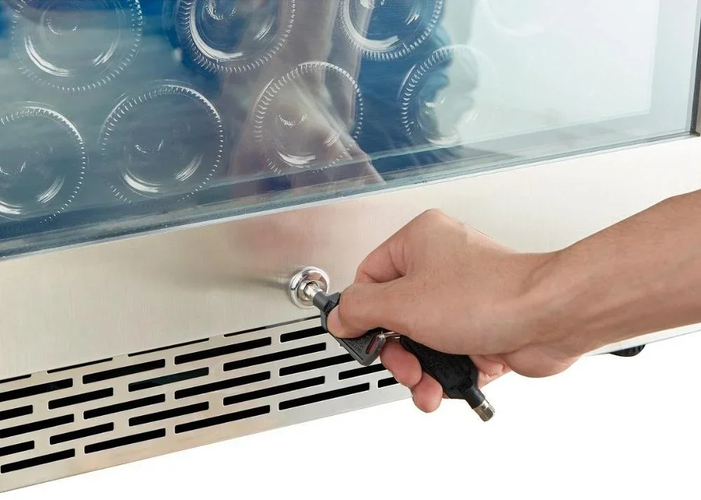 Дизайн сочетает строгие линии и премиальные материалы, что делает агрегат уместным как в современном интерьере, так и в классическом. Накладная ручка удобна для повседневного использования и не нарушает чистоту фасада. Двойное стекло с UV-защитой снижает воздействие солнечных лучей, что важно для сохранения вкуса и аромата вина. Черный металлический корпус подчеркивает респектабельность и стойкость к механическим воздействиям.