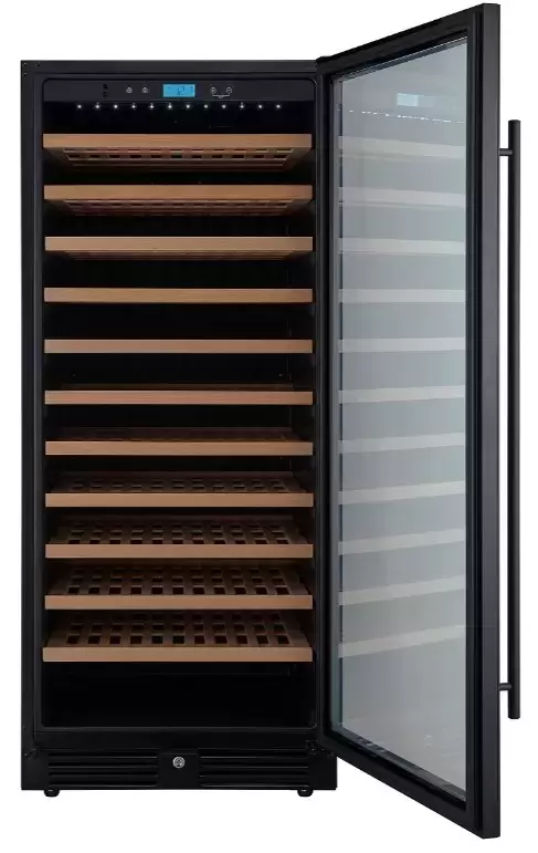 Стеклянная дверь — дополнительный изящный штрих к общему дизайну модели. Специальное покрытие защищает вино от влияния ультрафиолетовых лучей, которые проникают, если шкаф находится в солнечной комнате. Цвет корпуса — черный. Дверь можно перевесить на другую сторону, поэтому вариантов размещения его в доме становится больше.