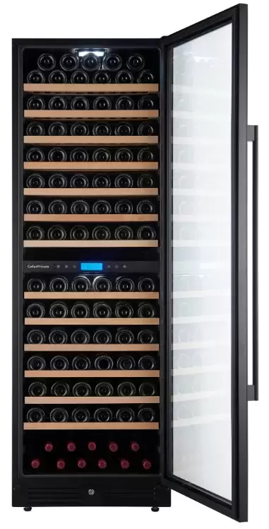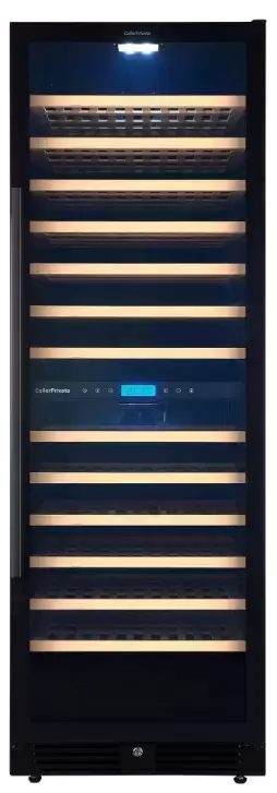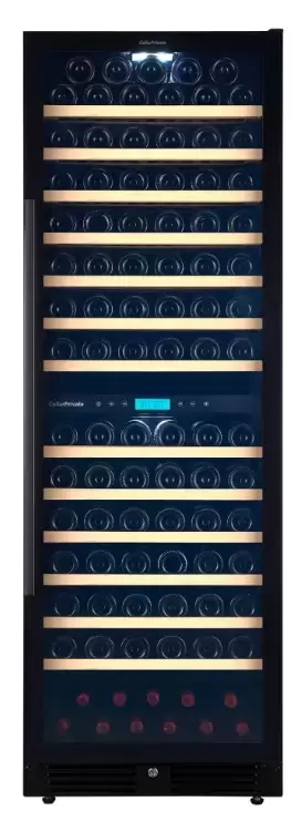 Винный холодильник CellarPrivate CP165-2TB имеет две температурные зоны, в которых одновременно можно хранить разные сорта алкоголя и выставлять разные сочетания настроек. Он встраивается в нишу, что удобно, если у вас ограничен метраж помещения. Количество бутылок, которое можно разместить с учетом полной комплектации и из расчета объема бутылки 0,75 л, — 163 шт.