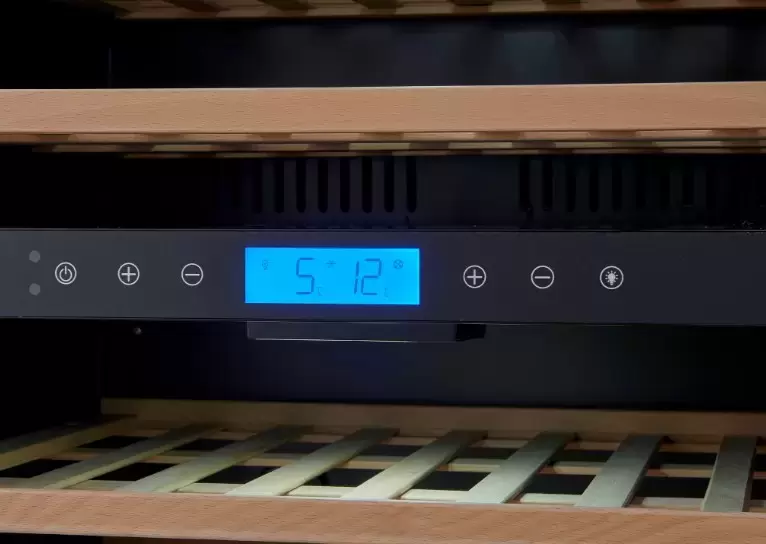 Электронное управление помогает быстро разобраться в том, как функционирует эта модель, и легко настроить все необходимые параметры. На дисплее отображаются данные, которые собирают датчики в камере. Лампочки, расположенные внутри, хорошо подсвечивают бутылки. Всего полок, на которых можно разместить коллекцию, в шкафу 13 шт. Пространство тщательно вентилируется, чтобы воздух не застаивался, не попадали посторонние запахи.