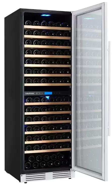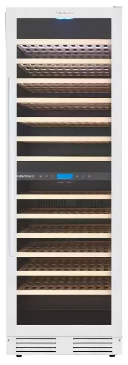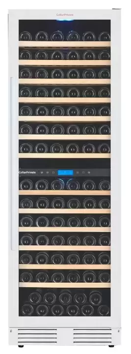 Винный холодильник CellarPrivate CP165-2TW имеет две температурные зоны, в которых одновременно можно хранить разные сорта алкоголя и выставлять разные сочетания настроек. Он встраивается в нишу, что удобно, если у вас ограничен метраж помещения. Количество бутылок, которое можно разместить с учетом полной комплектации и из расчета объема бутылки 0,75 л, — 163 шт.