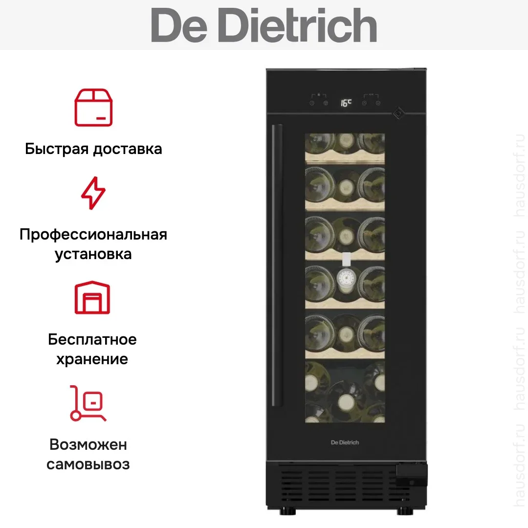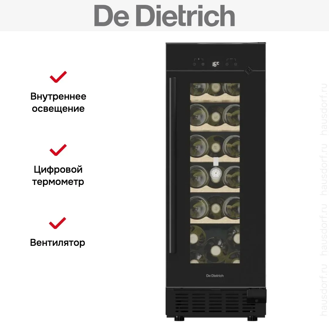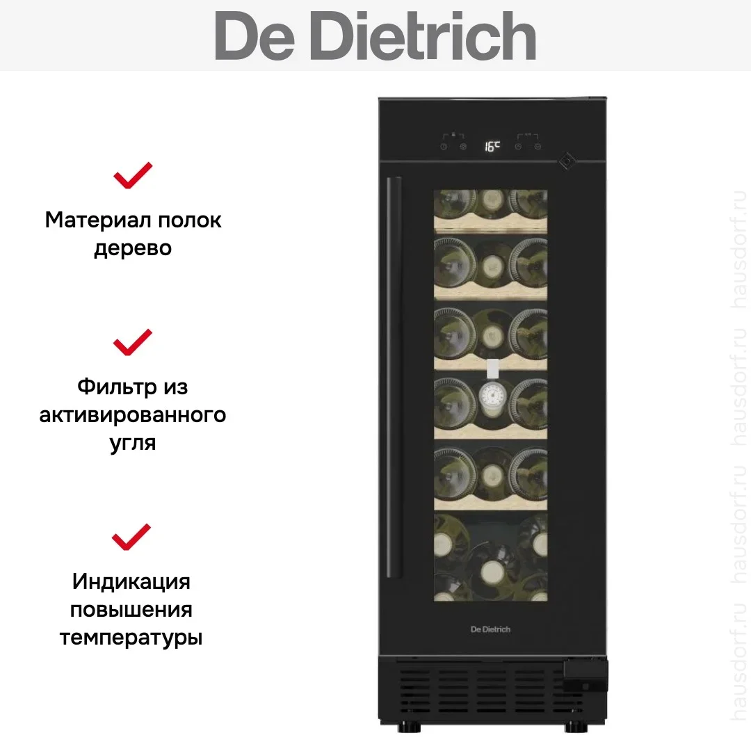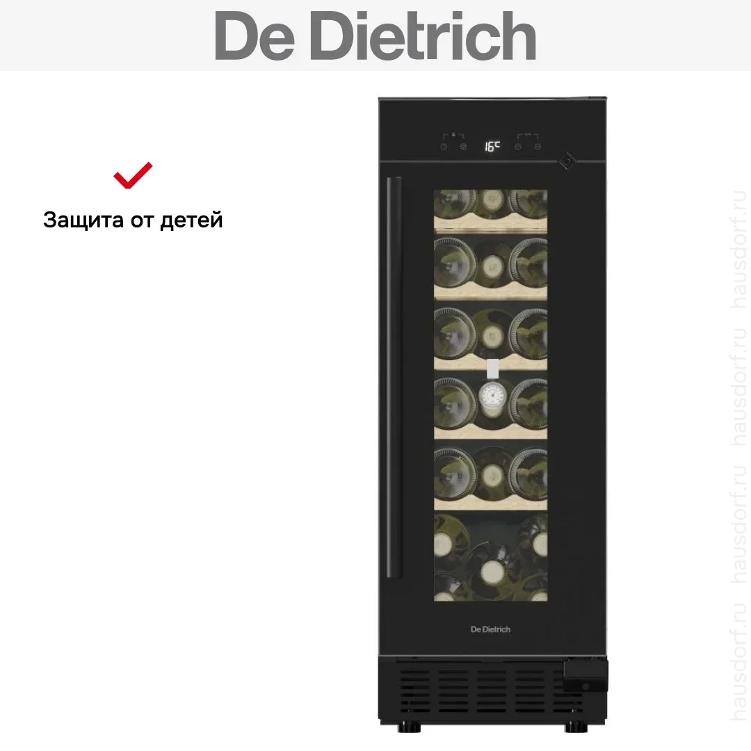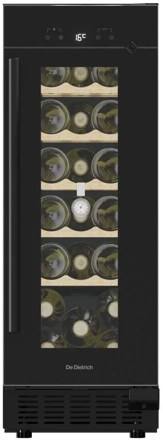 Встраиваемый винный шкаф De Dietrich DUW20FB выполнен в элегантном стиле Philharmonie и станет украшением любой кухни или винного уголка. Внешняя часть в чёрной рамке со стеклопакетом подчёркивает статус и аккуратно интегрируется в мебельный ряд. Накладная ручка и правый дверной упор обеспечивают удобство открывания, а тонированное стекло с UV‑защитой защищает напитки от губительного света. Благодаря компактным габаритам 82×29.5×57 см прибор легко разместить в нише 82.5×30×57.5 см, а регулируемые ножки упростят финальную подгонку по уровню.