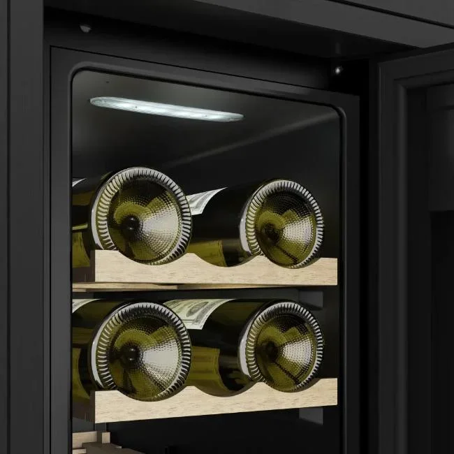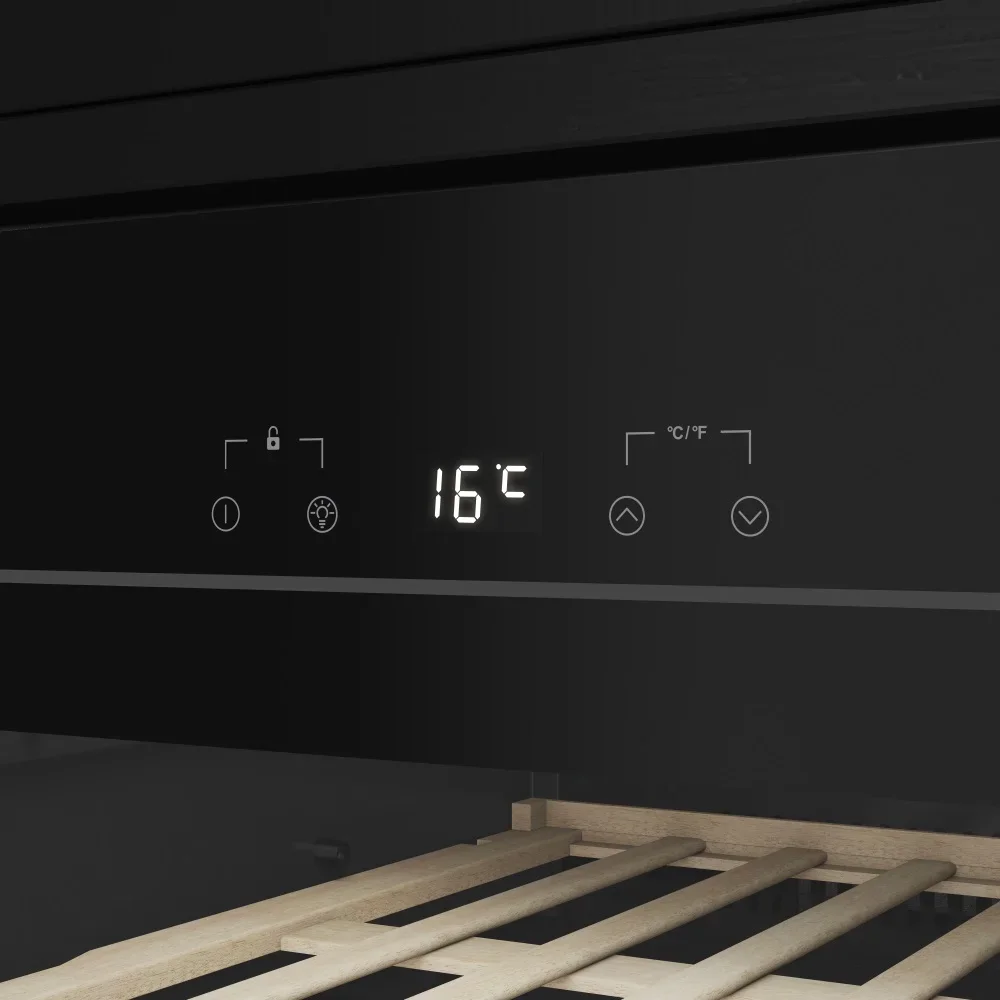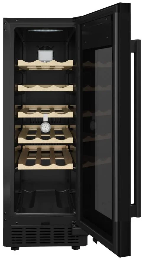 Внутреннее пространство рассчитано на 20 бутылок по 0,75 л и общий объём 56 л, что делает шкаф идеальным для небольшой коллекции. Пять деревянных полок мягко поддерживают бутылки и препятствуют скольжению, а натуральный материал минимизирует колебания температуры и вредное воздействие вибраций. Компрессорное охлаждение с одним компрессором обеспечивает стабильный температурный режим в диапазоне 5-20 °C, а автоматический контроль влажности позволяет сохранить пробки в оптимальном состоянии.