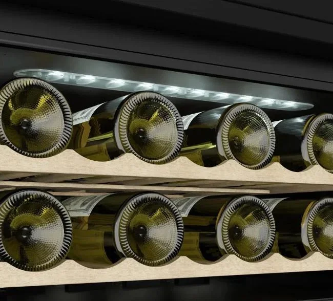 Управление сенсорное с цифровым дисплеем и цифровым термометром обеспечивает точную настройку и наглядность показаний. Звуковая индикация повышения температуры и сигналы о неисправностях предупреждают о рисках заблаговременно. Внутреннее светодиодное освещение выгодно подчёркивает содержимое и не нагревает бутылки. Устройство оснащено угольным фильтром и автоматическим контролем влажности для сохранения пробок и аромата напитков.