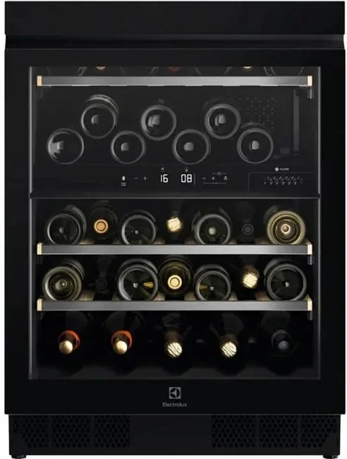 Винный холодильник Electrolux EWUD040B8B имеет две температурные зоны, в которых одновременно можно хранить разные сорта алкоголя и выставлять разные сочетания настроек. Он встраивается в нишу, что удобно, если у вас ограничен метраж помещения. Благодаря компактным размерам данная модель — отличный выбор для офиса, гостиничного номера. Количество бутылок, которое можно разместить с учетом полной комплектации и из расчета объема бутылки 0,75 л, — 40 шт.