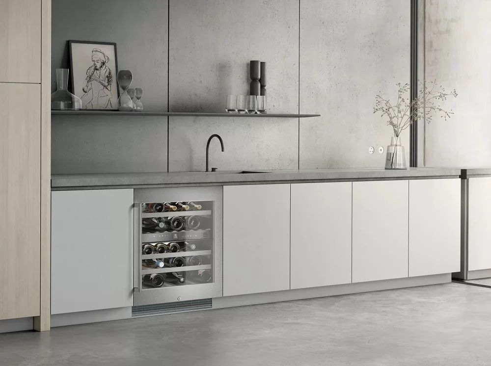 Встраиваемый винный шкаф Gaggenau RW404262 — это сочетание современного дизайна и передовых технологий хранения коллекционных напитков. Модель выполнена в элегантном исполнении из нержавеющей стали, что придаёт интерьеру кухни или гостиной особую утончённость. Компактные размеры (81,6—86,6х59,7х57 см), а также возможность установки в нишу с высотой от 82 до 87 см и шириной 60 см позволяют гармонично интегрировать шкаф в мебельный ансамбль. Стальная рамка стеклянной двери с защитой от ультрафиолетового излучения и функцией автоматического затемнения при закрытии надёжно оберегает содержимое от негативного воздействия света. Прозрачная дверца открывается на угол 115°, а наличие доводчика обеспечивает плавное и мягкое закрытие, что особенно удобно при ежедневном использовании.
