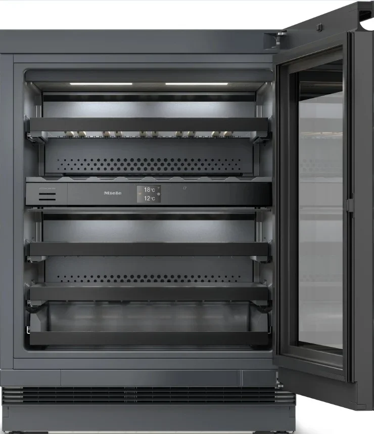 Винный холодильник Miele KWTUS 7074 F имеет две температурные зоны, в которых одновременно можно хранить разные сорта алкоголя и выставлять разные сочетания настроек. Он встраивается в нишу, что удобно, если у вас ограничен метраж помещения. Благодаря компактным размерам данная модель — отличный выбор для офиса, гостиничного номера. Количество бутылок, которое можно разместить с учетом полной комплектации и из расчета объема бутылки 0,75 л, — 32 шт.