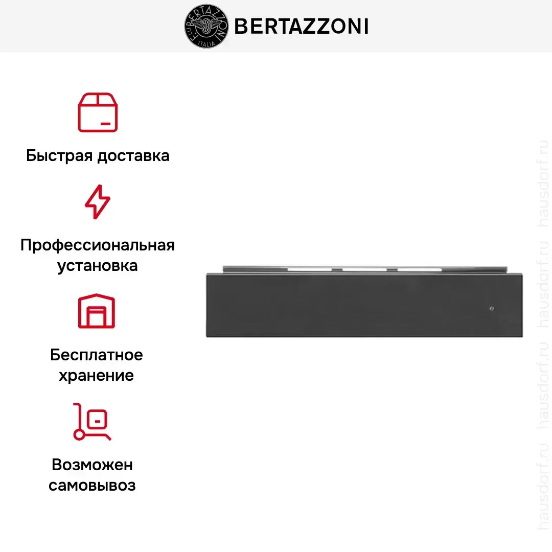 Bertazzoni WD60HERNE — встраиваемый ящик, предназначенный для подогрева посуды и поддержания ее температуры перед подачей блюд на стол. Металлический ящик способен выдержать нагрузку до 25 кг. Фасад прибора без ручек и других выступающих элементов защищает черное матовое покрытие с антикоррозийным эффектом. Открыть ящик легким нажатием поможет система Push&Pull, включающая направляющие полного выдвижения и механизм плавного хода. За фасадом находится поворотный переключатель для регулировки температуры нагрева от 30 до 85 градусов. Система индикации предупреждает о достижении нужной температуры. Для защиты мебели предусмотрена система охлаждения. В камере находится нескользящий резиновый коврик для бережного размещения посуды. Прибор совместим с духовыми шкафами Bertazzoni шириной 60 см для удобного монтажа.