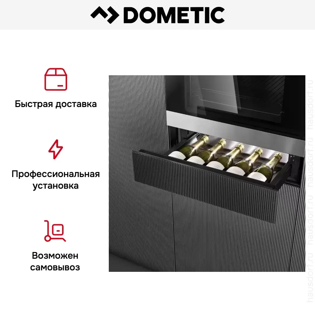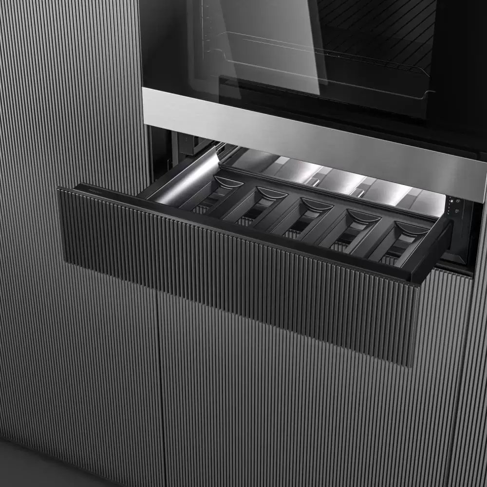 Выдвижной шкаф с одним отделением предназначен для хранения пяти бутылок стандартного размера. Для этого в камере установлены специальные силиконовые ячейки, которые фиксируют бутылки и не дают вину взбалтываться от толка, когда вы открываете ящик. Фронтальная панель предполагает навеску мебельного фасада — таким образом можно полностью скрыть технику в интерьере. Это идеальное решение для офиса и для квартиры с современным «бесшовным» дизайном.