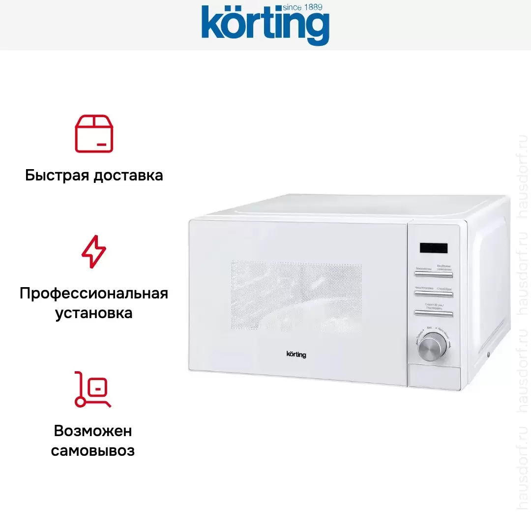 Микроволновая печь Korting выполнена в белом цвете — лаконичный современный дизайн подойдет любому интерьеру. Она устанавливается отдельно, за счет компактных размеров поместится на столе даже в небольшой кухне. Внутри есть встроенная подсветка. Дверной упор расположен слева, навесная дверца открывается с помощью кнопки.