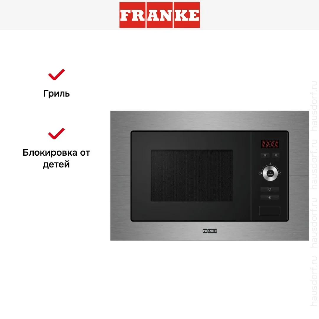 Встраиваемая микроволновая печь Franke FSL 20 MW XS — элегантный прибор для компактной кухни с продуманной эргономикой и аккуратной нержавеющей отделкой. Дизайн в стиле Smart сочетает строгие линии и минималистичные элементы, что делает прибор органичным в современных интерьерах. Корпус и лицевая панель выполнены в цвете «нержавеющая сталь», что придает кухне профессиональный вид и облегчает уход за поверхностью. Габариты 38,8×59,5×34,35 см и параметры ниши 38×56×50 см позволяют легко встроить прибор в стандартный кухонный модуль, не тратя лишнего пространства.