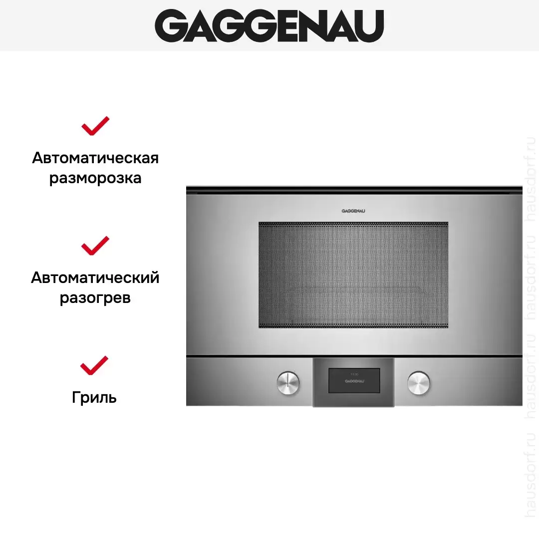 Количество режимов в данной модели Гаггенау: 3 шт. Для обработки продуктов и готовых блюд используются следующие виды нагрева: Микроволны, Гриль, Микроволны + гриль. Выберите гриль, чтобы получить поджаристую корочку на мясе или рыбе. Тип гриля в этой микроволновке кварцевый. Если вы спешите, а еду нужно разогреть, используйте быстрый старт — благодаря ему 30 секунд прибор работает на полной мощности. Автоматические программы для приготовления добавлены производителем также для упрощения работы.